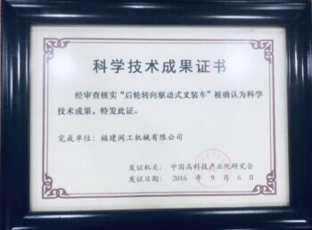 “The rear-wheel steering-driven forklift loader” was confirmed as a scientific and technological achievement by the China High-tech Industrialization Research Association.